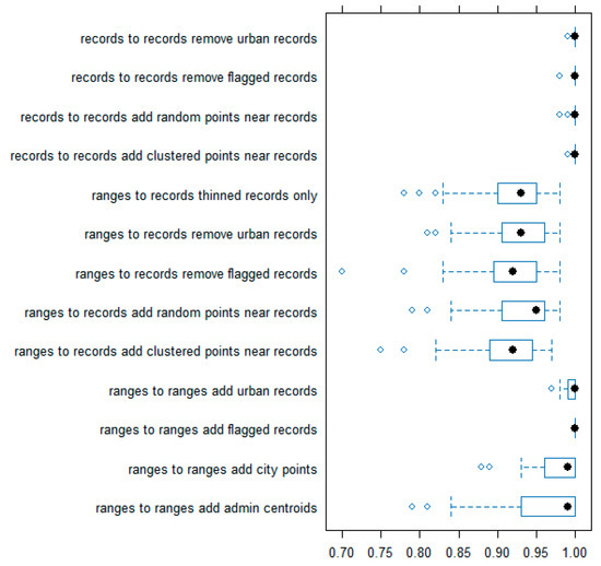 Niche overlap comparisons to predictions of species distributions (predicted probabilities ≥ 0.5) from either georeferenced records or range maps, for eight different additions or removals of potential locational and sampling bias errors (box plots with the box of first quartile to the third quartile, or interquartile range, with low and high whisker values, or dotted lines, no further than 1.5 * interquartile range, and outlying points). Georeferenced records and random samples from range maps were both robust to perturbation, and urban sampling bias was not an issue. All comparisons for species distribution models from georeferenced records, for each error type, had mean niche overlap values of 1.0, with minimum values of 0.98 for a few species. Relative to models from range maps, removal of flagged records slightly increased divergence in niche overlap values, for which outliers provided critical information from unsampled areas. Addition of unreasonable errors (at almost 15% error rate) from unrelated city and administrative centroid points to range maps resulted in the errors that overall produced the greatest mean departure of 0.03 and 0.04 (out of 1.0), values which were relative to range maps with no added errors.