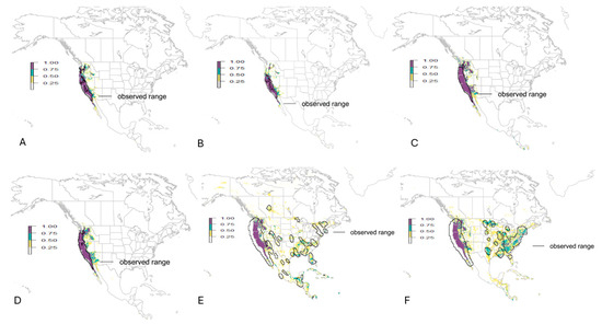 - Thuiller, W.; Brotons, L.; Araújo, M.B.; Lavorel, S. Effects of restricting environmental range of data to project current and future species distributions. Ecography 2004, 27, 165–172. [Google Scholar] [CrossRef]