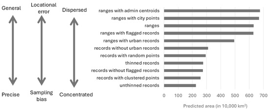 Area of predictions for species distributions (predicted probabilities ≥ 0.5) from unthinned georeferenced records, thinned georeferenced records, range maps, and eight different additions or removals of potential locational and sampling bias errors. As area of predicted species distributions increased, generality, locational errors, and dispersion increased and precision, sampling bias, and concentration decreased.