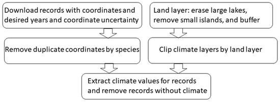 Intentional coordinate cleaning to simply remove duplicated coordinates and differentiate land areas is straightforward to add to workflows (Figure 7). The major concerns, aside from coordinates in urban areas, are duplicated information, collection year, basis of record (i.e., observations, preserved specimens, fossils, unknown), and separation of land from water [19]. Processing data to remove duplicated coordinates by species and fossils and unknown records is basic. Collection years likewise can be specified easily. Older records from museums probably contain errors but these require careful examination to understand the specific issues rather than automatic cleaning. Similarly taxonomic resolution also entails attention to preserve and reconcile at least primary synonyms, due to deprecation or unresolved and conflicting taxonomies, rather than simply removing samples of species with different scientific names in favor of one accepted name.