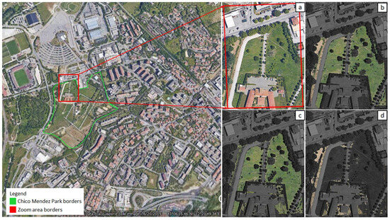 Greenpix evaluates canopy cover from digital images [36], identifying the number of pixels in different hue ranges and converting them in a surface unit of measure [37]. As shown in Figure 2, in a portion of Chico Mendez Park in Perugia given as an example, by selecting a different range of color between 0 and 360 degrees of the HSI (hue, saturation, and intensity) color model, it is possible to isolate and measure (in m2) different typologies of surfaces, i.e., the dry (yellow) grass of the lawn, from the bright-green lawn [38], or the white paths and paved surfaces. The HSI model, currently implemented in the Greenpix tool, is a color model that represents colors in a way that is more aligned with human perception than the RGB model, and it has already been used as an objective indicator for turf quality evaluations [37].