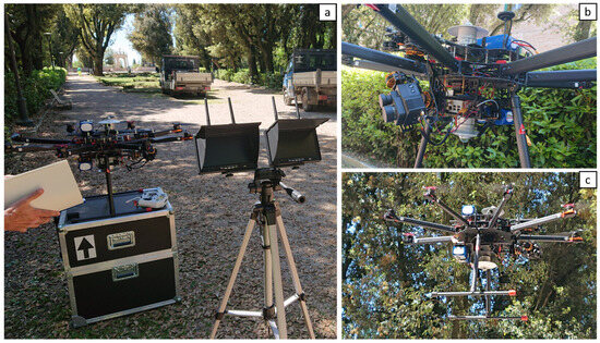 An albedometer is an instrument consisting of two pyranometers: one facing up-ward, toward the sky, and one facing downward, toward the surface under investigation. In Figure 3b, the two white-colored sensors (pyranometers) are clearly visible, positioned on the upper and lower parts of the drone, respectively. In Figure 3c, the drone in flight mode can be seen, along with the two monitors of the control system that allow for the real-time visualization of the footage from both the drone’s front camera and its thermal camera. The data measured by the two pyranometers are stored in the drone’s internal memory; the albedo value is also calculated in real time as the ratio between the intensity of the radiation incident on the upper sensor and the reflected radiation captured by the lower sensor. Albedo is usually measured using either a fixed sensor or a mobile sensor mounted on a pole and carried over the surface of interest. Using a drone equipped with an albedometer made it possible to collect data over various types of vegetation without stepping on it and covering larger areas.
