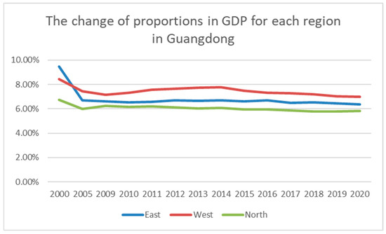 Proportions in GDP for each region in Guangdong Province. (Source: Guangdong Statistical Yearbook: National Accounts).
