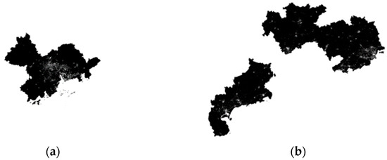 Nighttime light (NTL) data can be used as a proper measurement of the local social and economic activity level. These data are positively correlated with the municipal GDP, population, and size of the urban built-up area [26]. Then, the NTL data can be applied to evaluate the spatial structure and the hierarchical structure of the urban system [27], the urbanisation level of land use [28], and the development level of digital economy [29]. Previous research on the NTL in Guangdong focuses on the PRD region. Zhang et al. [30] discussed the expansion speed of construction land and urbanisation. Li et al. [31] investigated the high-speed development in the border region between the prefectural-level cities in the PRD region. Wang et al. [32] found that the convergence trend of the urbanisation rates in the urban agglomeration of the PRD was stronger than those in the urban agglomerations of the Yangtze River Delta and Jing–Jin–Ji regions. The inflows and outflows of population even enhanced this convergence trend.