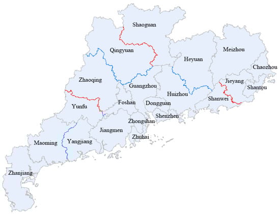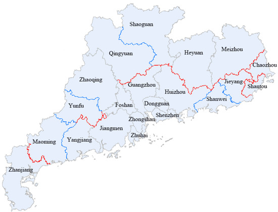 Guangdong Province, as a province with a large economic scale in China, ranked first in GDP among all provincial-level administrative units in 2021. This performance is led by the Pearl River Delta (PRD) urban agglomeration. However, the unbalanced development in East, West, and North Guangdong has attracted extensive attention from the provincial government for a long time. In the last century, the eighth Five-Year Plan for National Economic and Social Development in Guangdong Province announced the policy to develop the three regions. In the 10th Five-Year Plan, the regional coordinated development policy was pronounced, including the transfer of resource-processing industries and labour-intensive industries from the PRD to East, West, and North Guangdong. When the concept of the Pan-Pearl River Delta appears, the regional coordination emphasises the interaction between the PRD and East, West, and North Guangdong and industrial gradient specialisation. Two coastal economic zones in East and West Guangdong and one ecological economic zone in North Guangdong will be developed. The government attempted to avoid an economic structure in which East, West, and North Guangdong solely provide labour force to the PRD and rely on it for economic support. The 13th Five-Year Plan promoted that cities around the PRD, that is, Yangjiang, Yunfu, Qingyuan, Shaoguan, Heyuan, and Shanwei, will be initially economically integrated into the region. Transportation and industry connections will be built between these cities and neighbour PRD cities. The coordinated development for all cities in the province will be advanced sequentially. The policy of regional coordinated development also refers to the infrastructure construction in Hong Kong and Macau [1,2]. Although this policy does not change, the government implements this policy through the construction of local infrastructures and the industry transfer to the city-to-city integration targets for each city around the PRD. The changes in the detailed plans also reflect transitions in development stages over the past three decades.