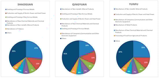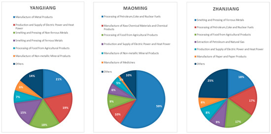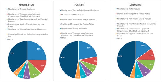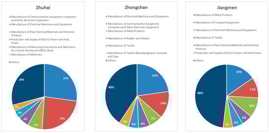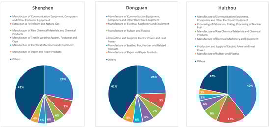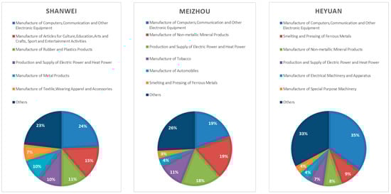 In another study analysing border effects within the PRD region using NTL data [54], industrial synergy has demonstrated a significant impact on regional economic convergence. Therefore, this research also attempts to discuss the issue from the same analytical perspective. Compared with transportation factors, the industrial synergy has indeed shown more a prominent impact on regional economic convergence. Figure 4 demonstrates the proportion of individual industry based on the gross industry output value in the prefectural-level yearbook in 2021. The industry added value is adopted in Jiayang as the gross industry output value is not available. Six industries with the highest proportions are shown in each prefectural-level city. In most cities, the six industries account for 60–70% of the gross industry output value. Figure 5 shows that most cities in East, West, and North Guangdong still take the upstream industry as the major industries, such as the Manufacture of Metal Products/Non-metallic Mineral Products, Smelting and Pressing of Ferrous Metals/Non-ferrous Metals, Processing of Food from Agricultural Products, and Manufacture of Textile. They may also take some traditional low value-added industries. The Manufacture of Computers, Communication, and Other Electronic Equipment, as a typical high value-added industry, has contributed to over 10% of gross industry output value in only Shanwei, Meizhou, and Heyuan, around 8% in Yunfu, and approximately 6% in Qingyuan. In other cities, the manufacture of machinery, equipment, and automobiles does not contribute to over 5% as one or two major industries. Most of the 12 cities still tend to promote the processing of raw materials and other low value-added industries.