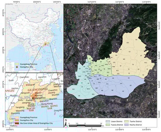 Since the core urban area of Guangzhou has concentrated on the typical characteristics of Guangzhou’s economy, society, and ecology in the process of urbanization, this study refers to the central urban area scope of the Guangzhou Territorial Spatial Master Plan (2021–2035) and delineates the study area as the four districts of Liwan, Yuexiu, Haizhu, and Tianhe, which contain 79 sub-districts. Sub-districts are the basic research unit of this study (Figure 1).