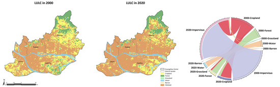 LULC change matrix, 2000–2020 (unit: ha).