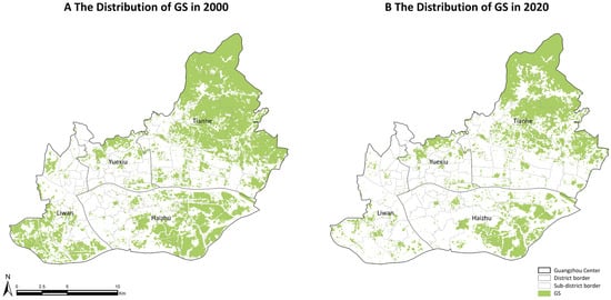 Figure 3 shows the Spatial distribution of GS in 2000 and 2020. In 2000, the total GS area in the central urban area of Guangzhou was 12,964.25 ha, while in 2020, it was 8483.26 ha, representing a 34.6% reduction relative to the baseline year.