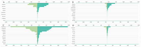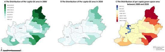 Figure 5C further demonstrates the changes in the spatial distribution of per capita GS area from 2000 to 2020. The results show that the per capita GS area of the vast majority of sub-districts decreased, among which Fenghuang Sub-district (658.12 m2/capita), Guanzhou Sub-district (421.31 m2/capita), Longdong Sub-district (402.39 m2/capita), Xintang Sub-district (268.23 m2/capita), and Huazhou Sub-district (215.57 m2/capita) at the urban fringe showed the largest declines. The per capita GS areas of Duobao Sub-district, Longjin Sub-district, and Hualin Sub-district remained unchanged, while those of Renmin Sub-district (0.04 m2/capita), Liurong Sub-district (0.13 m2/capita), Beijing Sub-district (0.48 m2/capita), Shamian Sub-district (1.54 m2/capita), and Liuhua Sub-district (5.35 m2/capita) increased slightly.