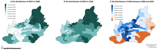 Figure 6 shows the Spatial distribution of NDVI in 2000 and 2020. The change in NDVI values were calculated by subtracting the normalized 2000 NDVI composites from the normalized 2020 NDVI composites, both derived from spatially averaged GEE datasets. Comparison with satellite imagery shows that the old urban areas of Guangzhou had significantly higher NDVI increases. The sub-districts with the most obvious average NDVI growth were Datang Sub-district (0.1360), Tianhe South Sub-district (0.1357), Xinghua Sub-district (0.1354), Dadong Sub-district (0.1354), and Sushe Sub-district (0.1316). In contrast, NDVI values decreased in some urban fringe areas, including Zhongnan Sub-district (−0.0730), Hailong Sub-district (−0.0674), Zhuji Sub-district (0.0556), Guanzhou Sub-district (−0.0438), Huazhou Sub-district (−0.0330), Pazhou Sub-district (−0.0285), Dongsha Sub-district (−0.0269), Xintang Sub-district (−0.0142), Chajiao Sub-district (−0.0064), and Huangcun Sub-district (−0.0014).