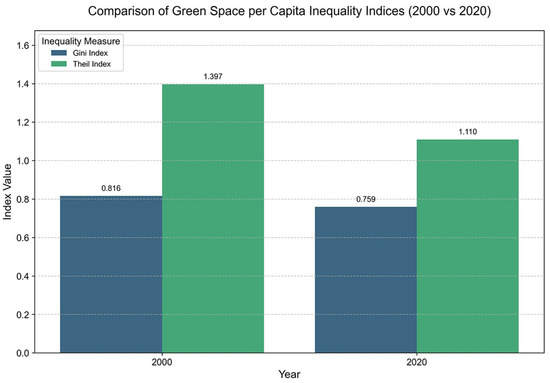 Gini index and Theil index of per capita GS area in 2000 and 2020.