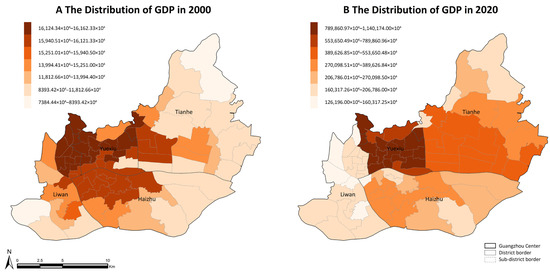 Figure 8 shows the Spatial distribution of GDP in 2000 and 2020. The total GDP for the urban area in 2000 was CNY 40,800 million, increasing significantly to CNY 1,160,000 million by 2020, reflecting substantial economic growth over the two-decade period. In 2000, the five sub-districts with the highest GDP values were Kuangquan (CNY 161.6233 million), Xicun (CNY 161.54 million), Zhanqian (CNY 161.54 million), Nanyuan (CNY 161.51 million), and Liuhua (CNY 161.49 million). Conversely, the five sub-districts with the lowest GDP were Hailong (CNY 73.8444 million), Fenghuang (CNY 83.9342 million), Liede (CNY 97.9466 million), Huazhou (CNY 101.9381 million), and Dongshan (CNY 103.3666 million).