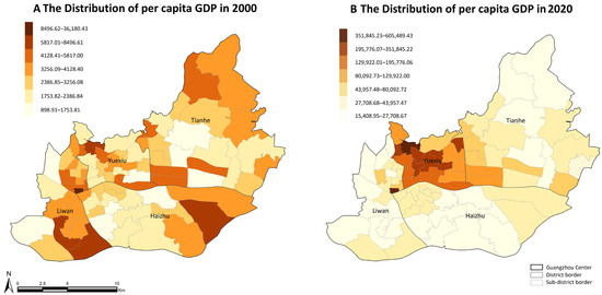 The spatial distribution of per capita GDP exhibits a divergent pattern from that of aggregate GDP (Figure 9). In 2020, the sub-districts with the highest per capita GDP were concentrated in Yuexiu District. Notably, Zhuji Sub-district in Tianhe District registered per capita GDP values substantially higher than those in surrounding areas.