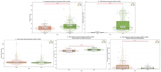 Spatial distributions (2000 vs. 2020): (A) population, (B) GDP, (C) GS area, (D) per capita GS, (E) maximum NDVI. The asterisk indicates significant differences. ** denotes a highly statistically significant difference, which typically corresponds to a p-value of less than 0.01. *** denotes an extremely statistically significant difference, which typically corresponds to a p-value of less than 0.001.
