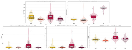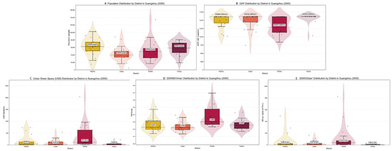 Spatial analysis revealed pronounced inter-district heterogeneity in Guangzhou (2000): Tianhe District functioned as a demographic–economic core, exhibiting both the highest population concentration (densest data distribution) and overwhelming GDP dominance (elevated median, mean, and long right tail). Despite containing the largest absolute GS stock, Tianhe’s per capita GS allocation was constrained by its massive population base. Yuexiu District demonstrated optimal per capita GS provision alongside stable above-average NDVI despite moderate economic/demographic metrics with compact distribution. Haizhu District registered peak NDVI values indicating superior vegetative potential but showed intermediate performance across population, GDP, and per capita UGS metrics. Conversely, Liwan District exhibited systemic deprivation: lowest-ranked in population, GDP (minimal median/mean), NDVI (weakest vegetation potential), and per capita UGS; its uniformly narrow distributional patterns across all metrics revealed homogeneous, district-wide disadvantage.