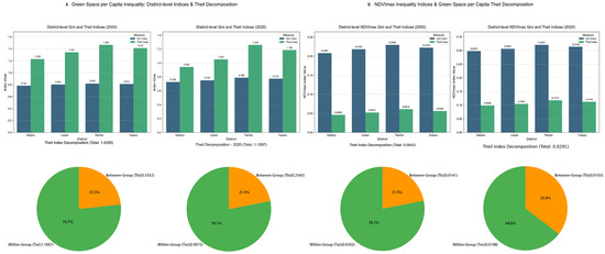 Decomposed Gini and Theil indices: (A) per capita GS, (B) NDVI by district, 2000 vs. 2020.