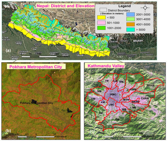 Study area: (a) District map of Nepal with elevation. (b) Pokhara Valley (Pokhara metropolitan city). (c) Kathmandu valley (Kathmandu metropolitan city—KMC; Lalitpur metropolitan city—LMC; Bhaktapur Municipality—BKTM; Suryabinayak Municipality—SM; Shankharapur Municipality—SHAM; Madhyapur Thimi Municipality—MTM; Changunarayan Municipality—CHAM; Chandragiri Municipality—CM; Budhanilakantha Municipality—BM; Tokha Municipality—ToM; Tarakeshwor Municipality—TM; Nagarjun Municipality—NM; Kirtipur Municipality—KM; Godawari Municipality—GM; Gokarneshwor Municipality—GoM; Kageshwori Manahora Municipality—KMM; Mahalaxmi Municipality—MM; Dakshinkali Municipality—DN.