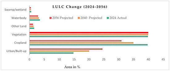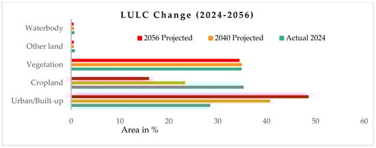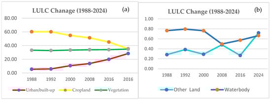 LULC change in %: (a) urban, cropland, and vegetation; (b) other land and waterbodies.