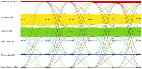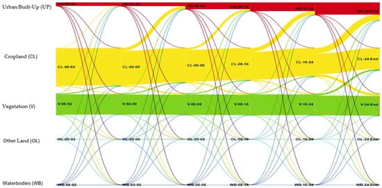 Between 1988 and 1992, a modest increase in urban/built-up area of 2.72 sq.km was witnessed, with 2.58 sq.km of this growth being derived from cropland (Table 4, Figure 4). However, this trend intensified markedly in subsequent periods. From 1992 to 2000, urban expansion surged by 33.2 sq.km, with cropland accounting for 31.90 sq.km of this change. The trend persisted during 2000–2008, during which 21.55 sq.km of urban area emerged, primarily through the conversion of 20.48 sq.km of cropland. A similar pattern occurred between 2008 and 2016 in the transition table, where 40.97 sq.km of cropland was lost to urban development, contributing to a total built-up increase of 42.92 sq.km. The most pronounced shift occurred during 2016–2024, with 59.04 sq.km of urban expansion, overwhelmingly derived from the conversion of 59.45 sq.km of cropland.