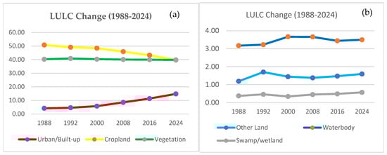 LULC change in%: (a) urban, cropland, and vegetation; (b) other land, waterbody, and swamp areas.