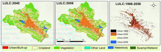 LULC maps: simulated maps, 2040 and 2056, Kathmandu valley (left) and (middle) panels, respectively); urban agglomeration, 1988–2056 (right) panel).
