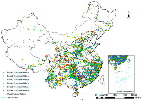 Spatial distribution of traditional villages across China by batch. Note: The map shows six batches of nationally recognized traditional villages, Batch 1 (green), Batch 2 (light green), Batch 3 (orange), Batch 4 (red), Batch 5 (blue), and Batch 6 (yellow-green).