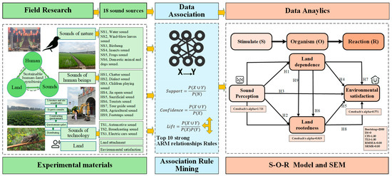 Research framework and procedural steps of this study. Note: The framework comprises three stages: (1) Field Research, identifying 18 sound sources (from nature, human activities, and technology), 8 land-related items, and 4 environmental satisfaction items through literature review, expert consultation, and surveys; (2) Data Association, using association rule mining (ARM) to detect relationships among sound perception, land attachment, and environmental satisfaction, yielding the top 10 strongest ARM rules; (3) Data Analysis, applying the stimulus–organism–response (S–O–R) model and structural equation modeling (SEM) to test links between sound perception, land dependence, land rootedness, and environmental satisfaction; and (4) Natural sound (NS), human sound (HS), and technology sound (TS) are used as abbreviations, while H1–H9 denote the nine hypothetical paths of SEM.