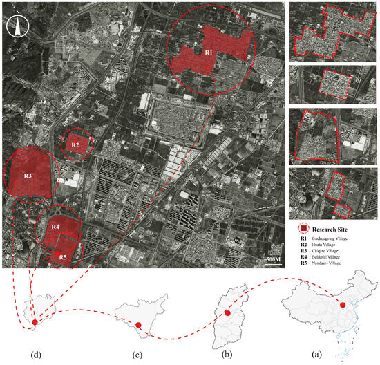 Locations of the five villages. Note: R1–R5 correspond to Guchengying Village, Huata Village, Chiqiao Village, Beidasi Village, and Nandasi Village, respectively. (a) Location of the study area in China, (b) in Shanxi Province, (c) in Taiyuan City, and (d) in Jinyuan District (source: Google Maps).