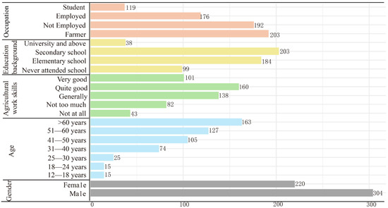 Based on the pre-testing results, each student survey was administered 5–10 min after a field measurement. A total of 600 questionnaires were distributed to the five villages on a random basis, of which 524 were collected from the five sites (125 from Guchengying Village, 96 from Huata Village, 117 from Chiqiao Village, 97 from Beidashi Village, and 89 from Nandashi Village), of which 304 or 58% were from males and 220 or 42% from females. The age distribution was 16–60 years old, and the largest age group was 30–60 years old, comprising more than 58% of the respondents. In terms of occupation, a larger portion of participants were farmers or had regular occupations, accounting for 36.6% and 33.6%, respectively. With respect to education level, secondary school participants dominated, accounting for 38.7% of those surveyed, followed by elementary school (35.1%) and university (7.25%). Proficiency in agricultural work skills was more evenly distributed, with the ‘quite good’ accounting for 30.5% (n = 160) and “average” for 26.3%, as shown in Figure 4.