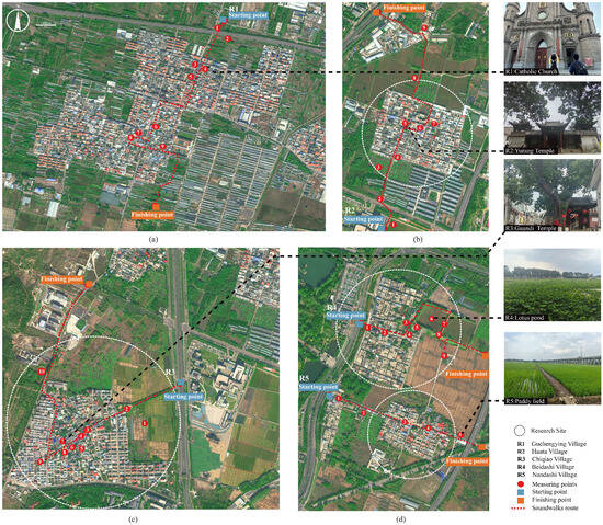 Measuring points and soundwalk routes in the five study villages. Note: (a) R1 Guchengying Village (Catholic Church), (b) R2 Huata Village (Yurang Temple), (c) R3 Chiqiao Village (Guandi Temple), and (d) R4 Beidasi Village (Lotus Pond) and R5 Nandasi Village (paddy field). Red circles mark measuring points, blue boxes mark starting points, and orange boxes mark finishing points. Dashed red lines indicate soundwalk routes, white dashed circles show measurement areas, and numbers indicate the order of measurement points (satellite imagery source: Google Maps).