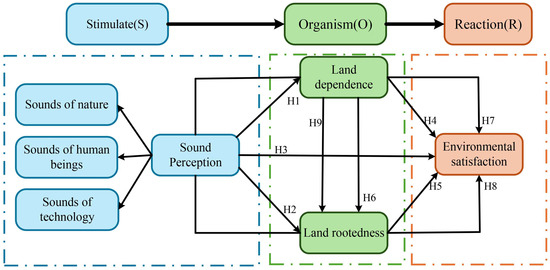 Meta-model of the sound–land–environment research path under the human–land perspective. Note: The model applies the stimulus–organism–response (S–O–R) framework to hypothesize relationships among three sound categories (nature, human activities, and technology), sound perception, land dependence, land rootedness, and environmental satisfaction. Arrows represent hypothesized paths (H1–H9) between variables.