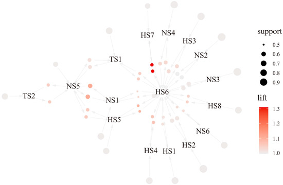 Visual analysis of soundscape perception using association rule mining (ARM). Note: Nodes represent sound sources (NS, nature sound; HS, human sound; TS, technology sound). Node size reflects support (frequency of occurrence), and node color indicates lift (strength of association), with darker red denoting stronger relationships. Arrows show the direction of association between sound sources.