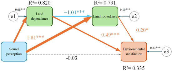 Hinge diagram of the “soundscape perception–land attachment–environmental satisfaction” cycle. Note: Arrows represent standardized path coefficients, with thickness proportional to effect size. Solid orange paths indicate significant positive effects; solid blue paths indicate significant negative effects; dashed lines indicate non-significant paths. R2 values show the variance explained for each latent variable. *** p < 0.001, * p < 0.05.