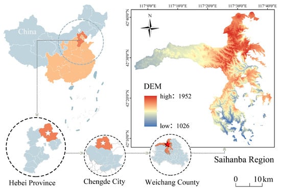 The study region, SHB, is located in Weichang County, Hebei Province, China (116°53′–117°39′ E, 42°4′–42°36′ N), at the southern edge of the Horqin Sandy Land in Inner Mongolia []. The region covers an area of approximately 933.33 km2 and encompasses six sub-forestry stations, with an elevation range from 1010 to 1939 m (Figure 1). The region has a temperate continental monsoon climate, with semi-arid and semi-humid conditions. The average annual temperature is −2.7 °C, and precipitation occurs mainly from June to August, averaging 460.3 mm annually. Snow cover lasts for seven months, and the frost-free period is only 64 days each year [,]. The selected study years (2002, 2012, and 2022) correspond to pivotal stages in SHB’s ecological restoration: the designation of the region as a National Nature Reserve in 2002, the transition to multifunctional forest management in 2012, and the culmination of decades-long restoration efforts in 2022.