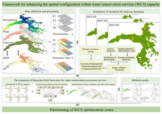 Compared to the investigation conducted in the Weihe River Basin, China, by Zeng et al. [], our work not only identifies the key driving factors of WCS using BBN but also simulates multi-scenario land-use projections for 2035 by integrating the CA-Markov model. This approach achieves dynamic coupling of “scenario prediction—functional assessment—spatial optimization” and clarifies optimization directions under different development pathways through a three-step framework (Figure 2). To our knowledge, this dynamic approach represents the first application of its kind in ES research within the study area [,].