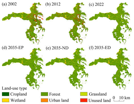 Spatial distribution of land-use types for the Saihanba region in (a) 2002, (b) 2012, (c) 2022, and (d–f) 2035. ED, economic development scenario. ND, natural development scenario. EP, ecological protection scenarios.