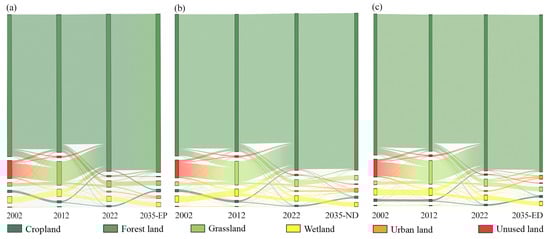 Land-use transition diagram from 2002 to 2035 under (a) ecological protection (EP), (b) natural development (ND), and (c) economic development (ED) scenarios.