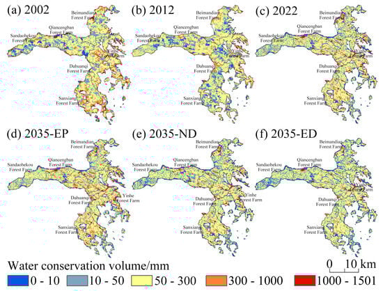 Furthermore, the overall WCS volume in the SHB region exhibited a heterogeneous spatial distribution pattern (Figure 5). In 2002 and 2022, the central-southern and eastern parts of the SHB region displayed high WCS volumes, particularly in the Dahuanqi Forest Farm, Sanxiang Forest Farm, and Yinhe Forest Farm (Figure 5a,c). In contrast, poor WCS volume was observed in these parts of the SHB region in 2012, particularly in the Sanxiang Forest Farm (Figure 5b). Moreover, parts with high WCS value were sparsely distributed in 2012 (Figure 5b), whereas in 2002 and 2022, their distribution was relatively concentrated (Figure 5a,c). Under the simulated EP scenario for 2035, WCS volumes in the Sanxiang Forest Farm and Yinhe Forest Farm showed a remarkable increase compared to 2022 (Figure 5d), while changes under the ND and ED scenarios were minimal (Figure 5e,f).