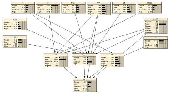 The BBN for WCS capacity was constructed using Netica software (NORSYS Software Co., NORSYS, Québec, Canada). Each node in the BBN is characterized by a conditional probability table (CPT), the discrete states of the node variables, and their corresponding probability distributions [,]. The CPT quantifies the relationship between a parent node X and a child node Y, with each row of the table representing the state combinations of the parent node and the conditional probability P(y/x). The probability distribution of the child node is determined by the probability distribution of the parent node and the CPT. In the absence of parent nodes, the probability distribution is the prior probability distribution P(x). For example, the CPT for the child node of evapotranspiration is presented in Supplementary Table S3. The joint probability of all variables in the BBN was calculated by multiplying the conditional probability distributions of all nodes, as shown in the following formula []: