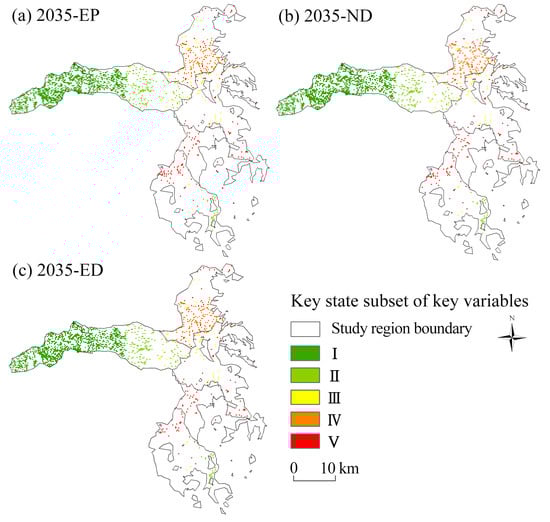 Distribution of key state subsets in water conservation service for the Saihanba region in 2035 under (a) ecological protection (EP), (b) natural development (ND), and (c) economic development (ED) scenarios.