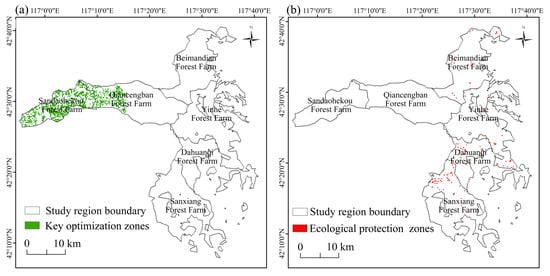 The (a) key optimization and (b) ecological protection zones of water conservation service for the Saihanba region in 2035.