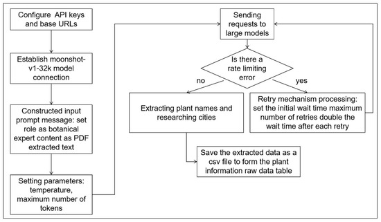 As shown in Figure 3, the corresponding API key and base URL are configured to establish the connection with the specified LLM “moonshot-v1-32k” [33]. Moonshot-v1-32k is one of the built-in models of Kimi, featuring a maximum context length of 32,768 tokens. It demonstrates strong multilingual capabilities, particularly in Chinese and English, and excels at generating safe, informative, and accurate responses. During the invocation process, requests are sent to the LLM by constructing input prompts that define the role of the model, include the text to be processed (extracted from PDF documents), and specify parameters such as temperature and maximum token length to control the characteristics of the generated output. To handle potential rate-limiting errors, a retry mechanism is implemented. This mechanism includes configurable settings such as initial wait time, maximum number of retries, and exponential backoff, thereby enhancing the stability and fault tolerance of the system. The extracted plant names and corresponding research cities are stored in a CSV file, forming the foundational dataset for plant species analysis.