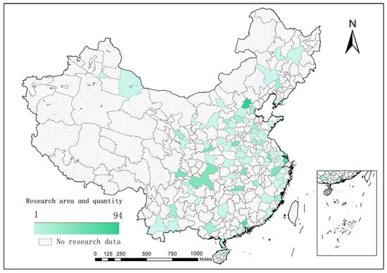 Diversified integration of plant data: All plant names are compiled, and duplicate entries are automatically removed. The resulting list of unique plant names is then submitted to an online plant taxonomy verification tool to supplement detailed information, including Latin names, families, genera, authors of nomenclature, and species IDs from the PPBC. This process results in the construction of a comprehensive overview table of green roof plant species in China. Then, according to the most widely used combination of green roofs [34], all plants are categorized according to trees, shrubs, and groundcovers, and the names of each type of plant are deduplicated to construct a classification list of plant combinations for green roofs in China. Finally, the raw data are categorized according to the three categories and corresponding cities, and the plants categorized in each city are de-emphasized to construct the three types of plants for green roofs corresponding to each city. The number of current research papers on green roofs and the distribution of corresponding cities are shown in Figure 4.