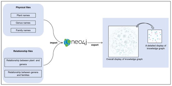 Construction of the knowledge graph (KG): In this study, the Neo4j 5.25.1 graph database is selected. Figure 5 shows the flowchart for constructing the knowledge graph. The specific operation is to organize the plant names, family names, and genus names into three entity files. Then, the relationships between the plant names and the genera, as well as the relationships between the genus names and the family names, are sorted into two relationship files. Subsequently, these entity files and relationship files are imported into the Neo4j graph database through the function of “LOAD CSV WITH HEADERS”. The “MATCH” function of Neo4j is utilized to match the entities and relationships to realize the construction of the plant KG, providing a basic dataset that can be directly used for the research on intelligent question answering of the LLM.
