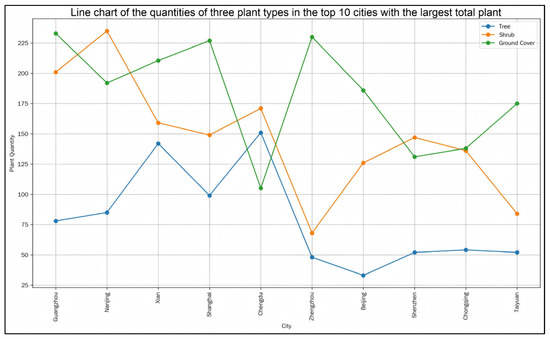 Chart of the quantities of three plant types in the top 10 cities with the largest total plant.