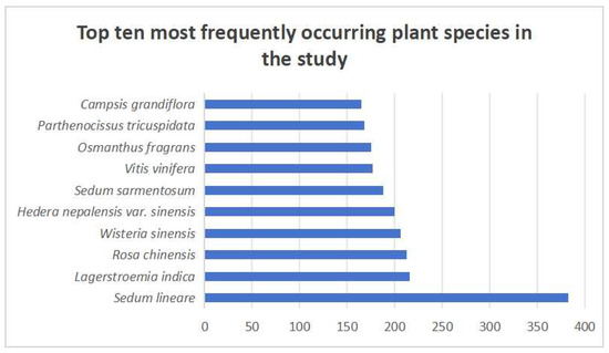 Further analysis of the statistical data enables a clear identification of the plant species with the highest number of occurrences. As shown in Figure 11, the top ten most frequently used species include Sedum lineare, Lagerstroemia indica, Rosa chinensis, Wisteria sinensis, Hedera helix, Sedum sarmentosum, Vitis vinifera, Osmanthus fragrans, Parthenocissus tricuspidata, and Campsis grandiflora. These species have consistently appeared with high frequency in previous studies, underscoring their prominent role in the practice of urban green roof development.