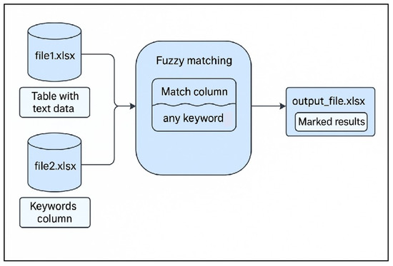 As shown in Figure 12 and Algorithm S1 in the Supplementary Materials, a Python-based data-processing workflow is implemented to perform fuzzy keyword matching between two Excel datasets. Specifically, the script loads two spreadsheets, file1.xlsx and file2.xlsx, using the pandas library. The first file contains the primary dataset to be annotated, while the second file holds a list of Chinese keyword entries. After extracting and cleaning the keyword list to remove missing or blank values, a custom function is defined to perform fuzzy matching by determining whether any of the keywords appear as substrings within the target text field of the primary dataset. This function is then applied across all entries in the specified matching column, and the results are annotated with a “match” label where applicable. Finally, the processed dataset is exported to a new Excel file, enabling straightforward identification of records containing relevant keywords.