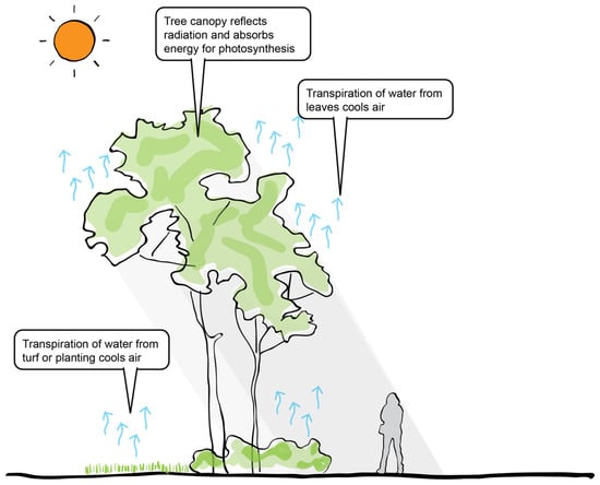 In contrast, vegetated surfaces in parks and gardens absorb and re-radiate less heat, resulting in lower land surface temperatures. This phenomenon has come to be known as the Park Cool Island (PCI) effect [] (Figure 1). Urban designers are increasingly interested in understanding the effects of UHI and PCI on improving summer thermal comfort conditions in urban settings, particularly the role of parks as refuges. Moreover, parks are also described as mitigating UHI effects in high-level policy documents, such as Australia’s recent National Urban Policy, which describes how ‘Green spaces play a key role in mitigating the urban heat island effect by providing shaded pathways, cooler environments and more comfortable conditions’ [].