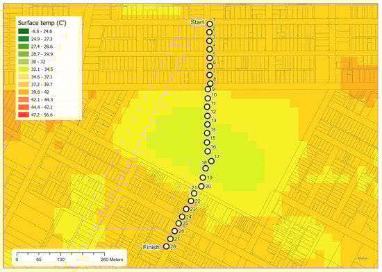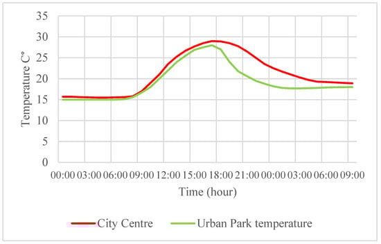 The figure below compares the remotely sensed and measured land surface temperatures [] for the Garry Meinck Park case study (Figure 10). The land surface temperature is approximately the average of the daytime measured temperatures in Figure 9. A negligible land surface temperature difference is recorded between the park and the urban catchment in the remotely sensed data.
